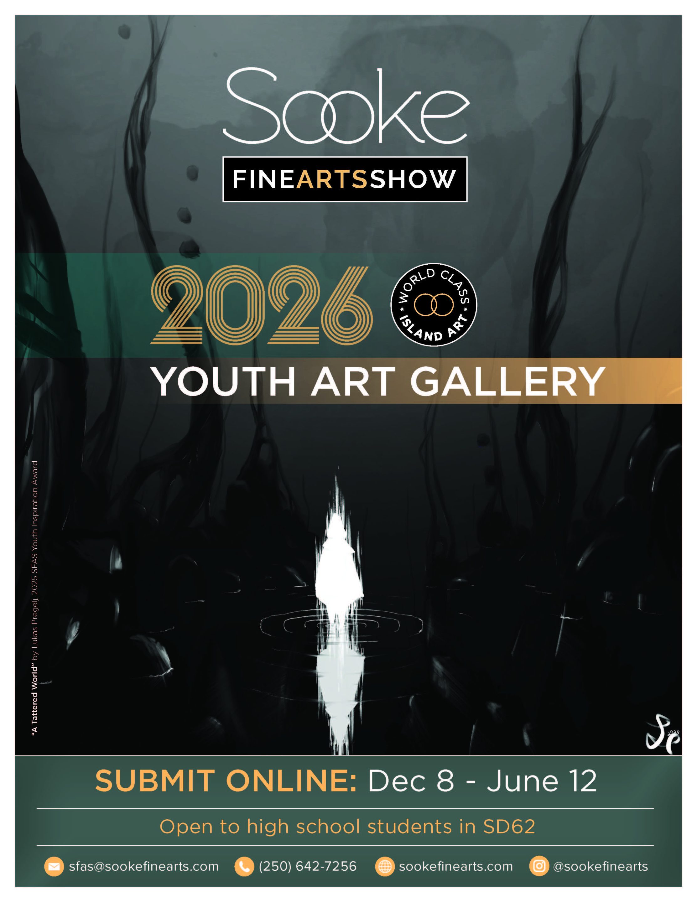 Youth Artists in grades 9-12 in the Sooke School District 62 (including homeschooled students) are encouraged to apply online between May 1 – June 15, 2025 for the SFAS online Youth Art Gallery. Each student is permitted to enter up to 3 pieces in digital format.